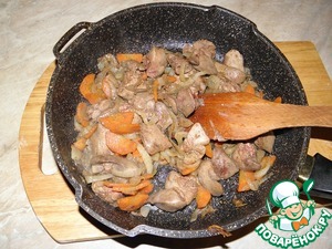 Добавить к печени с овощами, проверить на специи. Перемешать и потушить в районе 7-10 минут.