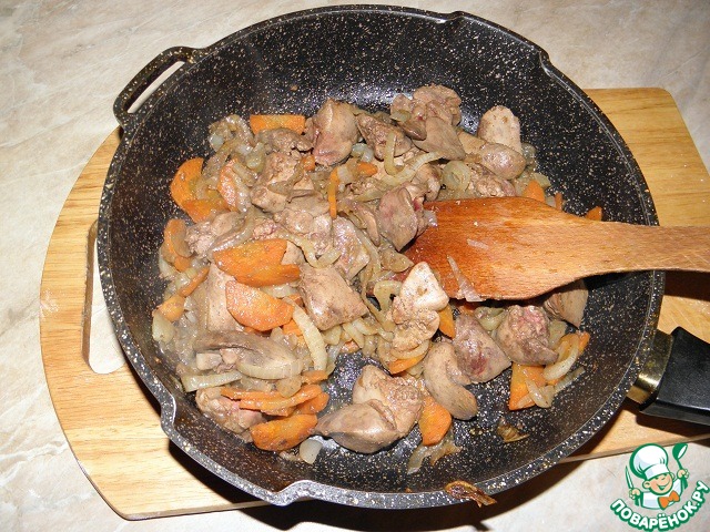 Печенку промыть, очистить, нарезать на 3-4 части, добавить к почти готовым моркови с луком.