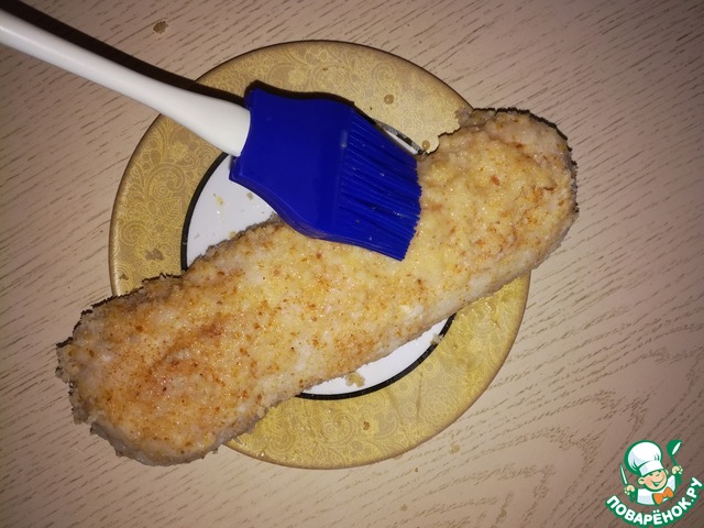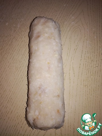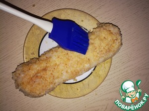 Обваливаем наше полено в панировочных сухарях, смазываем яйцом и ещё раз обваливаем в панировочных сухарях.