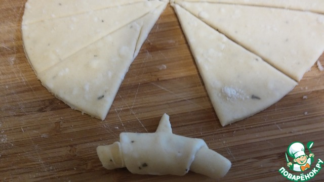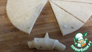 Разделить тесто на 6 частей. Расскатать тесто толщиной 0,5 см. Разрезать на 8 сегментов. Удобнее всего резать ножом для пиццы.