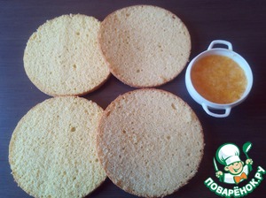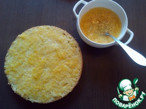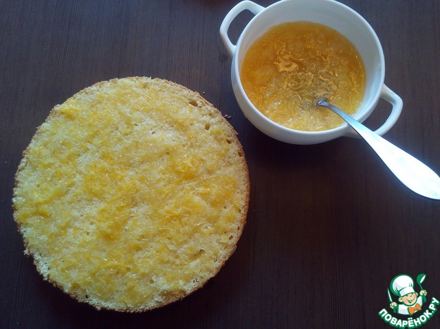 Начинаем собирать торт. Пропитываем бисквит нашей пропиткой равномерно распределяя мякоть.