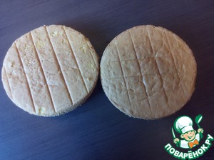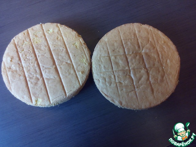 Режем наш бисквит, каждый на два коржа.
