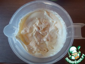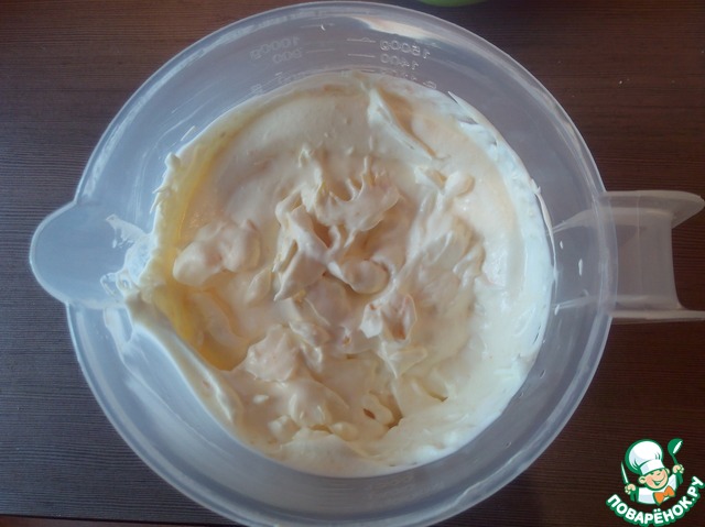 Отделяем белки от желтков. Взбиваем отдельно 3 белка с 50 гр сахара, отдельно 3 желтка с 50 г сахара. После аккуратно перемешиваем и вводим 100 гр просеянной муки и 1 ч. л. разрылителя. Я пекла два бисквита на форму 22 см. Вы можете печь один и разрезать потом на 4 коржа. Но два бисквита легче делить :). Выливаем тесто в противень застеленный пергаментом и ставим в заранее разогретую духовку до 180° на 25 - 30 мин.