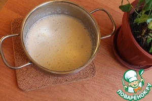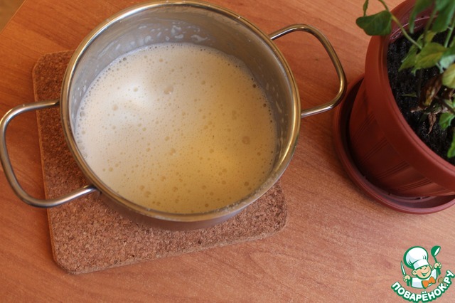 Разведенную желтковую смесь вливаем в молоко на плите, варим на тихом огне, помешивая, до загустения (около 3-5 минут). Снимаем с огня.
