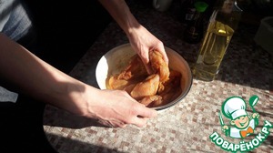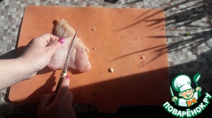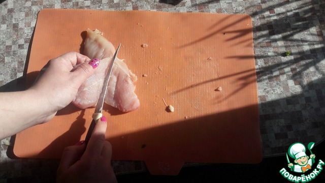 Берем куриное филе, режем тонкими пластами. У нас получилось каждый кусочек на 3 части