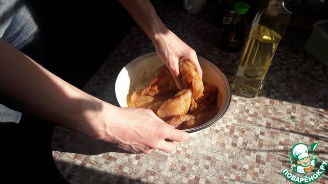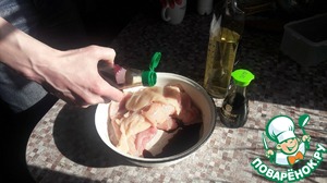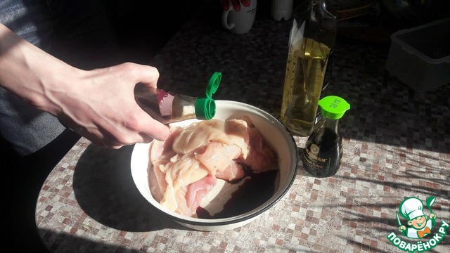 Складываем порезанное филе в глубокую посуду, наливаем туда подсолнечное масло, бальзамик и соевый соус.