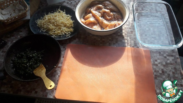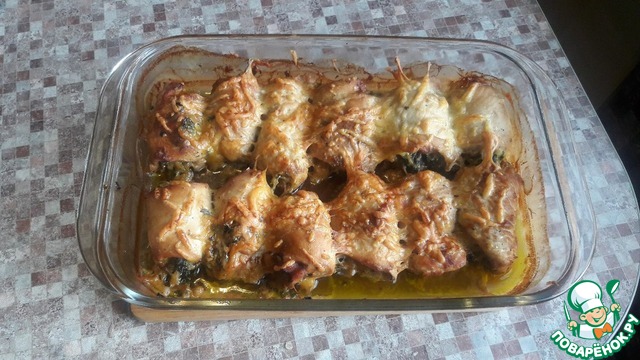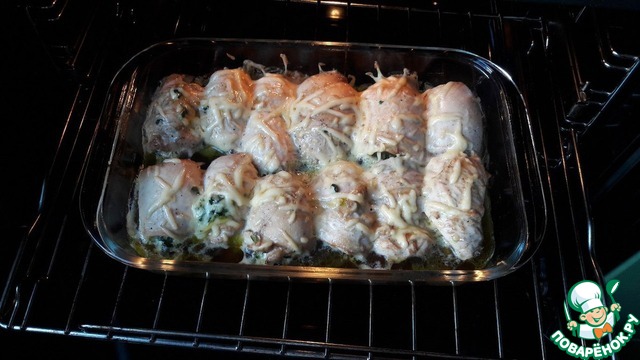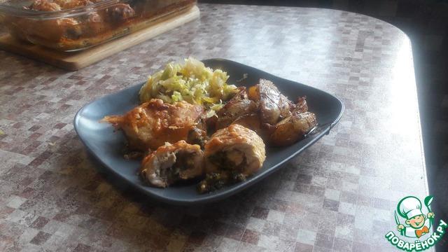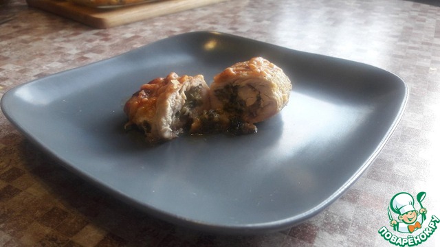 На кусочек куриного филе кладем около чайной ложки шпината, добавляем сыр (примерно столько же), заворачиваем в рулетик