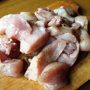 Куриное филе нарезать крупными кусками, посолить, посыпать приправой.