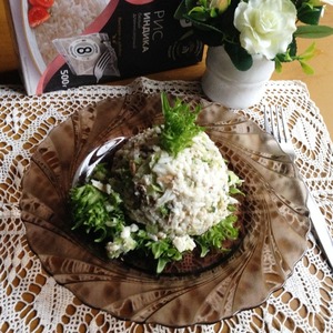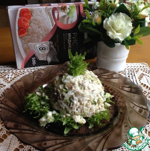 РИс отварить в кипящей подсоленной воде по инструкции на упаковке. Охладить. Яйца отварить вкрутую, охладить, натереть на тёрке.