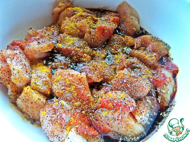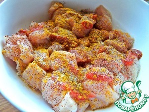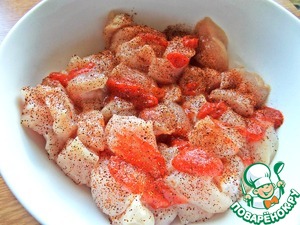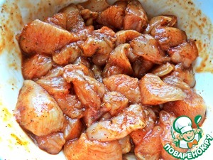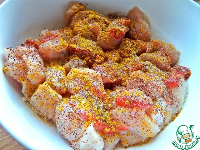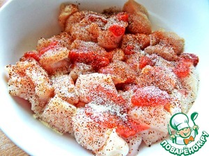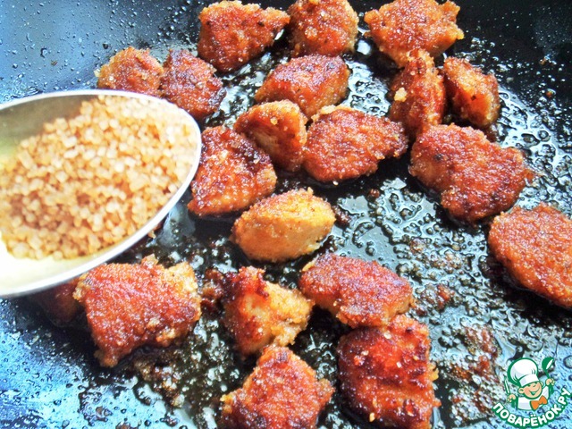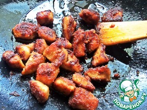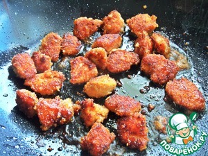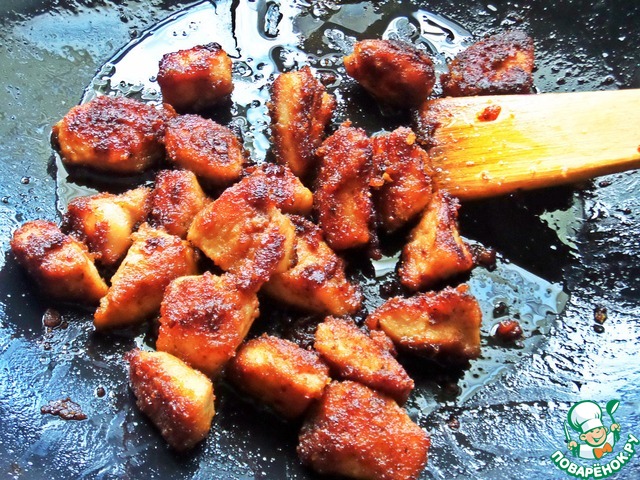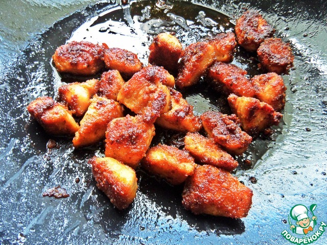Разогреть сковороду вок с растительным маслом и выложить на дно порцию кусочков.