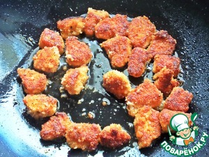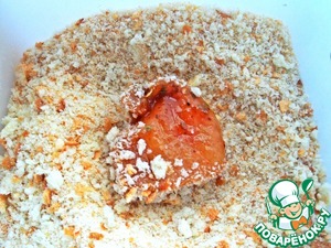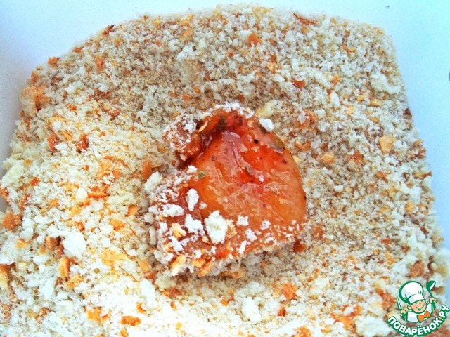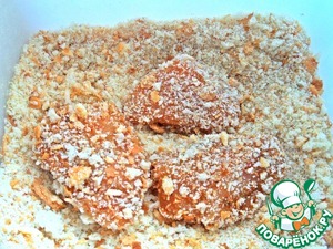 Каждый кусочек филе подцепить вилкой и перенести в домашние сухари.