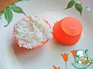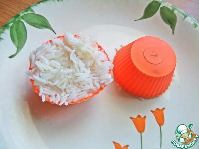 Рис высыпать из пакетика, тут порция. Можно придать форму такую.