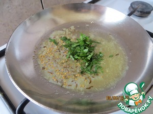 Имбиря и кинзы не было, я добавила молотый кориандр и порошок имбиря в масло.