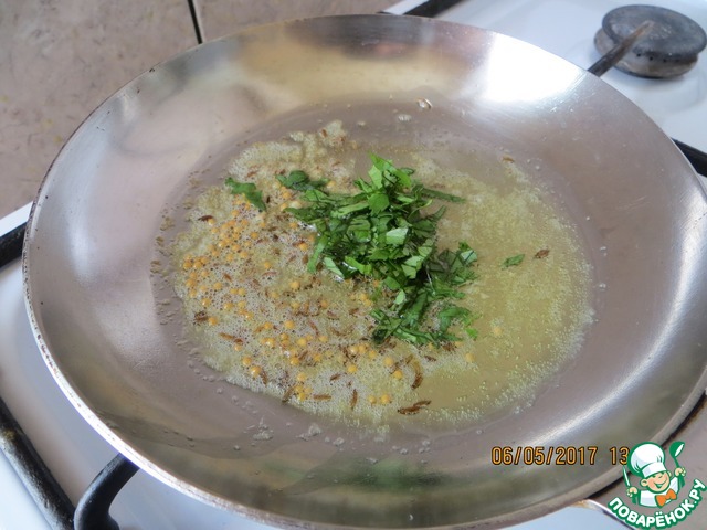 Нагрейте сливочное масло (в идеале гхи), добавьте семена горчицы и кумина. Пассеруйте, пока семена не начнут потрескивать,