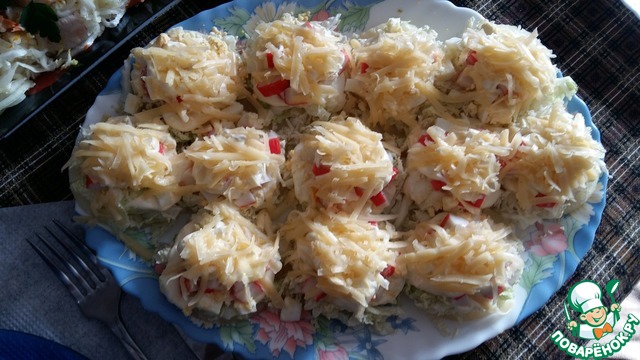На ананасовые кольца выложить пекинскую капусту, которую предварительно порезать или порвать кусочками.