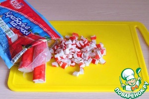 Крабовые палочки порезать мелкими кубиками.