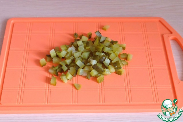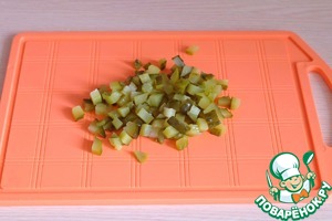 Маринованные огурцы порезать мелкими кубиками.