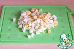 Яйца отварить, порезать кубиками.