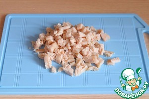 Куриное филе отварить в подсоленной воде, порезать кубиками.