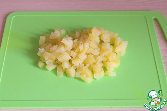 Картофель отварить в подсоленной воде, порезать мелкими кубиками.