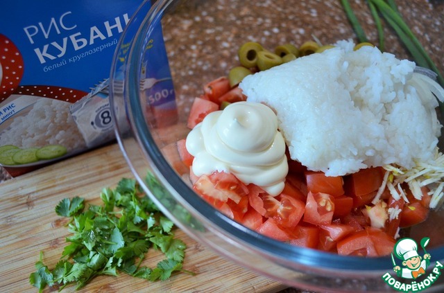 Охлажденный рис отжать, выложить в салатник, заправить майонезом.