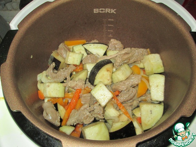 Выложить в мультиварку баклажан и перец, закрыть крышку и тушить 5-6 мин.