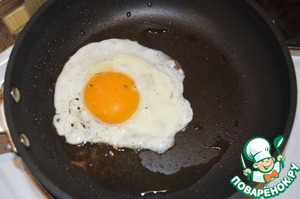 Далее жарим яйца на отдельной сковородке. При подаче на стол, на каждый бифштекс из говяжьего фарша выкладываем яйцо-глазунью.