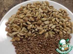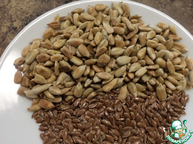 Семечки подсушить на сковороде до слегка золотистого цвета. Семена льна остаются в неизменном виде.