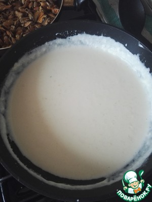 Теперь приготовим соус. Для этого сливочное масло растопить на сковороде, добавить муку. Я добавляю 1 ст. л. так как люблю жидкий соус, кто любит погуще, смело добавляйте 2 ст. л.. немного обжарить. Добавить сливки, постепенно, чтобы не образовалось комочков. Посолить, Довести до кипения, и снять с огня.