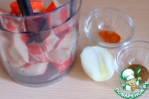 Крабовое мясо добавить в блендер, добавить паприку (1 ч. ложка), добавить соль и черный молотый перец по вкусу, добавить 1/2 части луковицы. Пробить крабовое мясо до однородного состояния.