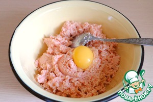 К подготовленному фаршу добавить яичный желток. Фарш хорошо вымешать.