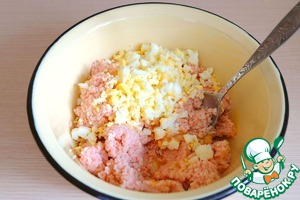 Добавить к подготовленному фаршу яичную крошку. Фарш еще раз хорошо вымешать.