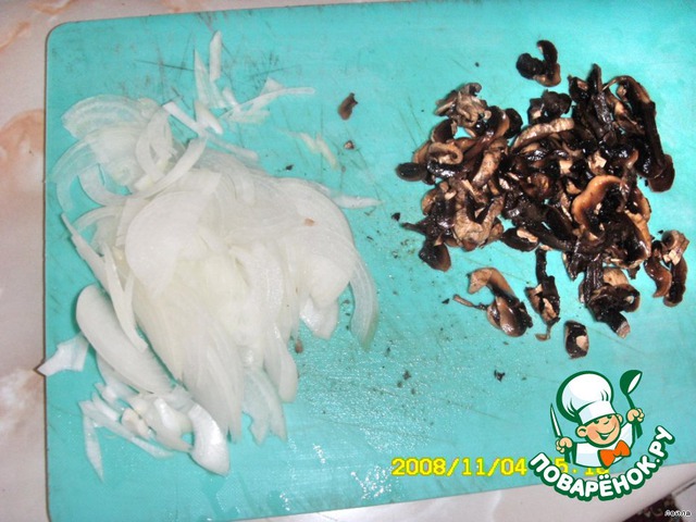 Вначале обжарить лук, затем положить грибы, жарим-тушим под крышкой. После обсыпать манкой и обжарить еще мин. 5.