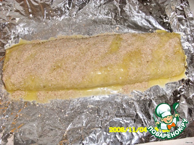 Завернуть с помощью фольги, сверху обмазать яйцом, посыпать сухарями, немного кунжута не помешает. Кладем в духовку на 20-25 мин. до зарумянивания.