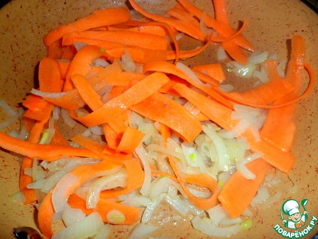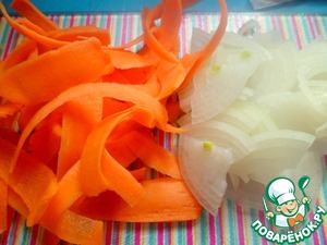 Натереть морковь тонкими полосками - овощечисткой и нарезать четверть кольцами лук.