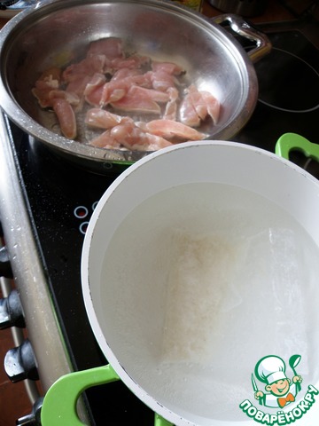 Поставить кипятиться воду на рис, очистить овощи, нарезать филе полосками примерно 3 х 1,5 см. Опустить рис вариться и на разогретом масле немного обжарить филе.