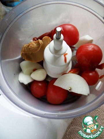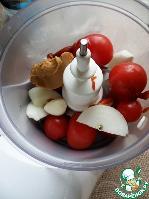 В блендере пробить лук, чеснок, помидоры и кетчуп с арахисовой пастой в однородную массу.