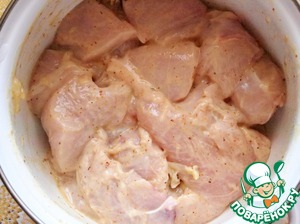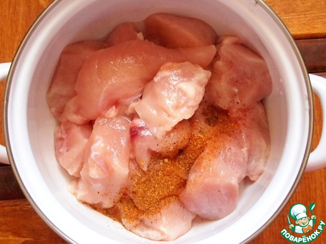Куриную грудку промыть, порезать на кусочки. Добавить специи, соль.