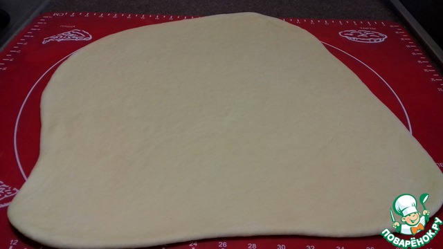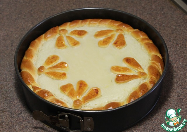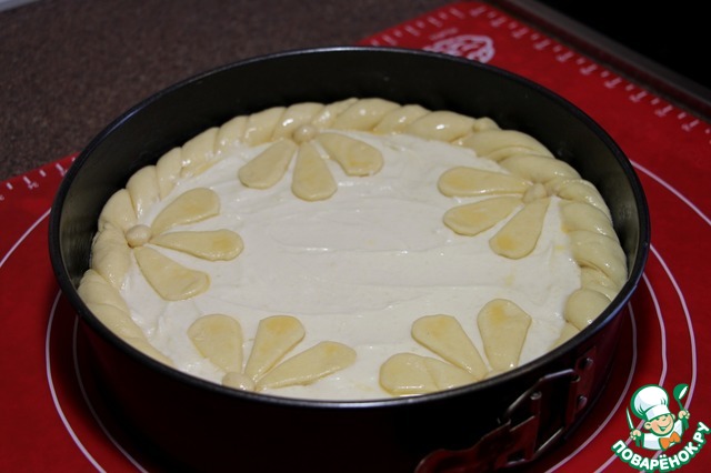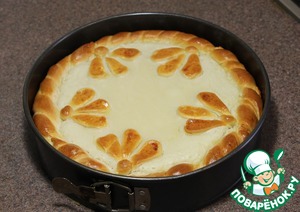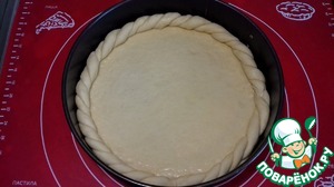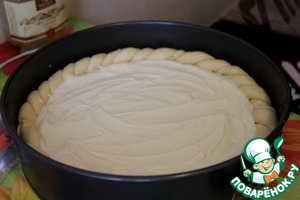 Дно формы (я брала форму диаметром 26см) застелить бумагой для выпечки, стенки смазать сливочным маслом. Вырезать дно пирога из теста по окружности формы, выложить его в форму. Затем скатать два жгута, каждый толщиной 1см, и переплести их между собой. Полученную косичку уложить по окружности пирога, предварительно смазанной разболтанным яйцом. Накрыть заготовку для пирога и оставить на расстойку на 20 минут.