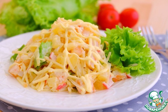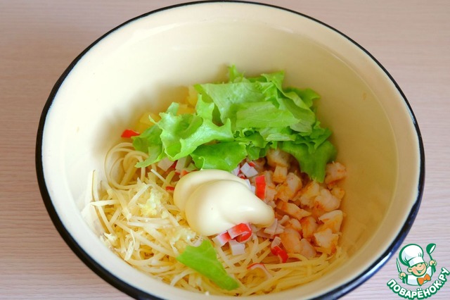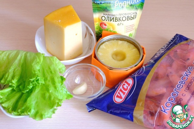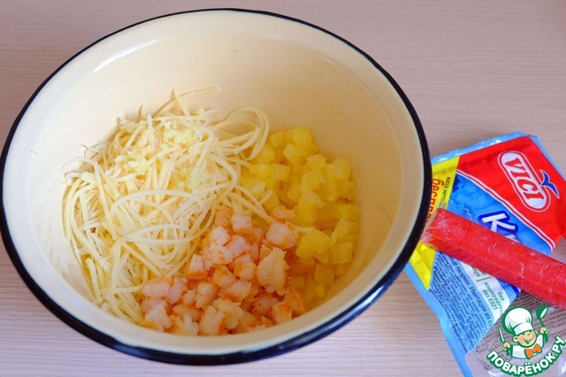 Твердый сыр натереть на мелкой корейской терке. В миску добавить порезанные кубиками креветки, ананасы, сырную соломку. Чеснок 1 зуб. чеснока пропустить через чесночный пресс, добавить в миску к составляющим салата