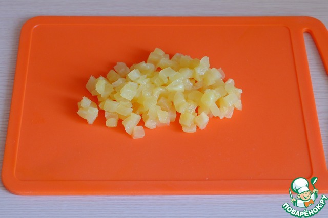 Кольца ананаса достать из сиропа, слегка обсушить бумажным полотенцем, порезать мелкими кубиками