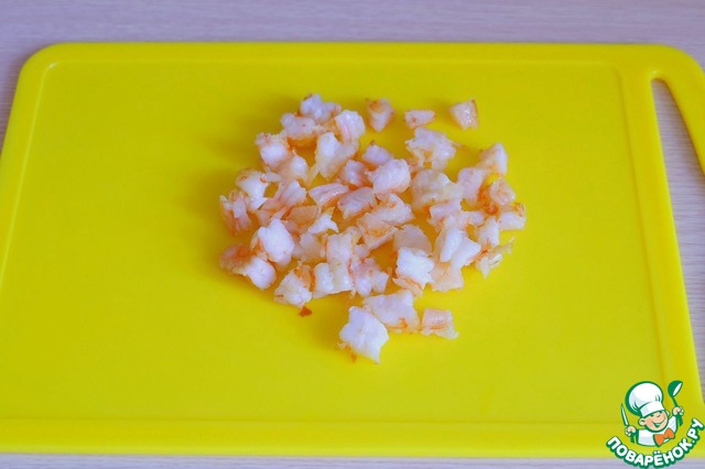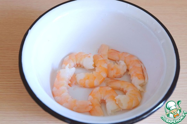 Креветки разморозить, удалить панцирь, хвостик, желудок и кишечник. Креветки промыть