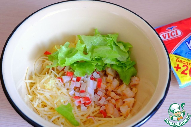 Очень вкусный салат. Этот салат понравится тем, кто любит салаты с морепродуктами.