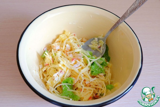 Листья салата порвать небольшими кусочками, добавить в миску, добавить порезанные кубиками крабовые палочки. Добавить по вкусу соль