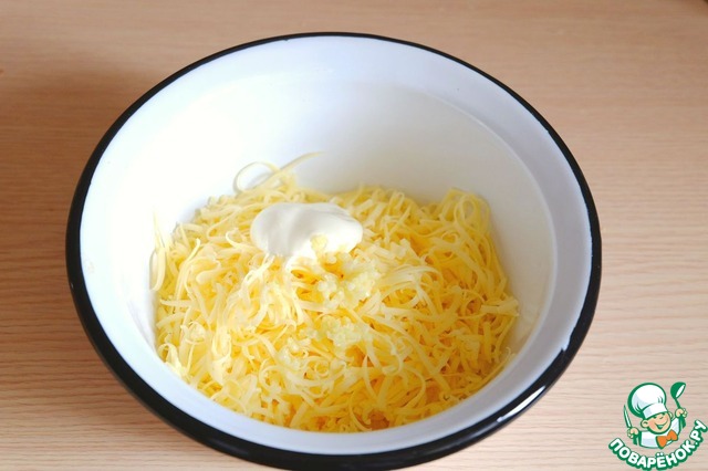 В миску добавить тертый сыр (200 гр) и пропущенный через чесночный пресс 1 зуб. чеснока,