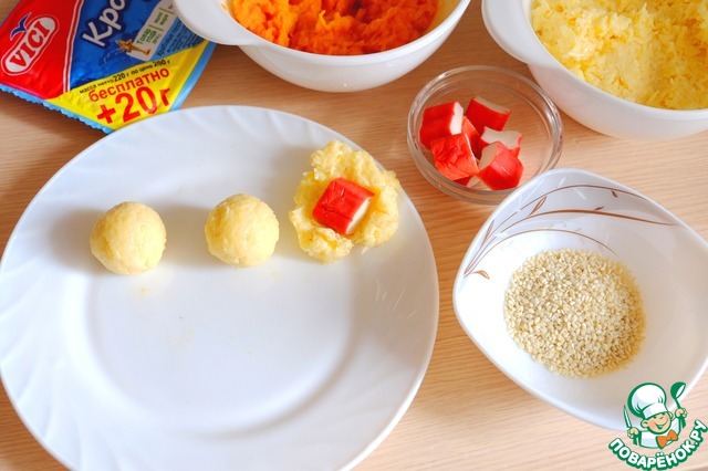 Рецепт «Закуска "Сырные шарики с крабовыми палочками"»:
