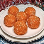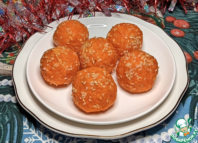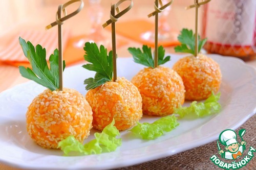 Равномерным слоем покрыть сырный шарик морковным фаршем, затем готовый шарик обвалять в кунжутном семени.