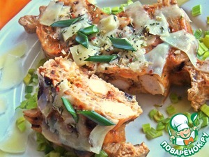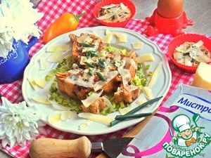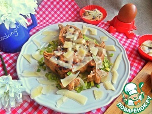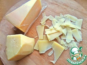Твёрдый сыр нарезать слайсами. У меня литовский пармезан.