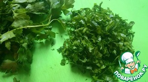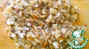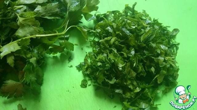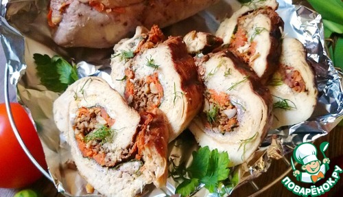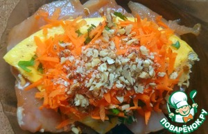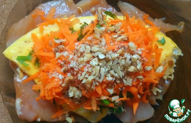 На каждое куриное филе слоями выкладываем по четверти "омлета", петрушки, моркови, орехов. Немного придавливая начинку, сворачиваем в рулет.