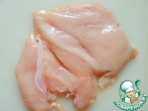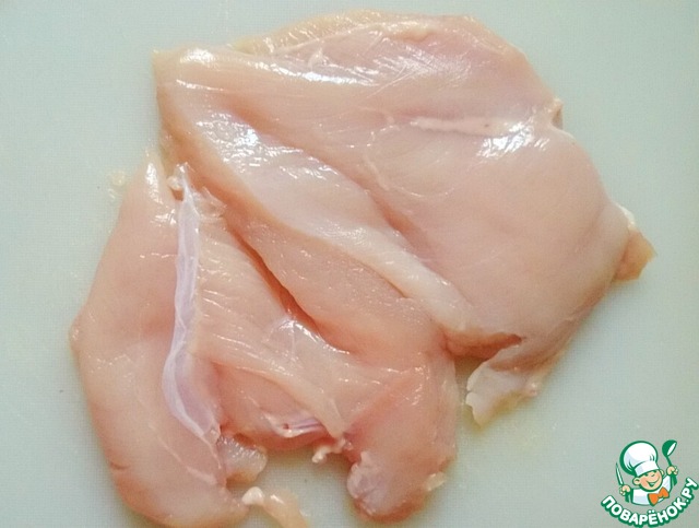 Куриное филе надрезаем, раскрываем, как книжку, немного отбиваем сковородой или скалкой (не молотком с зубчиками и т. п., чтобы не произошло разрыва волокон и, как следствие, чтобы жидкость сильно не вытекала).